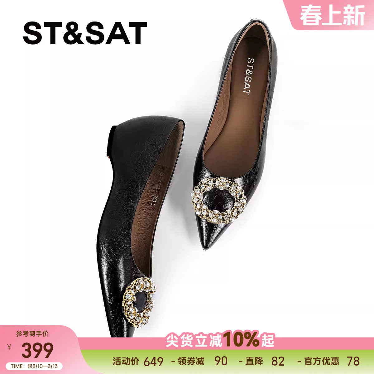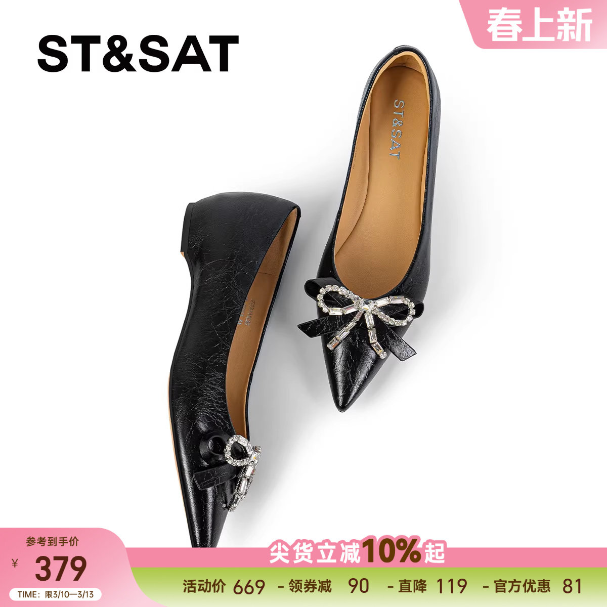 星期六真皮尖头蝴蝶结水钻女鞋2025年春季新款平底轻奢风浅口单鞋