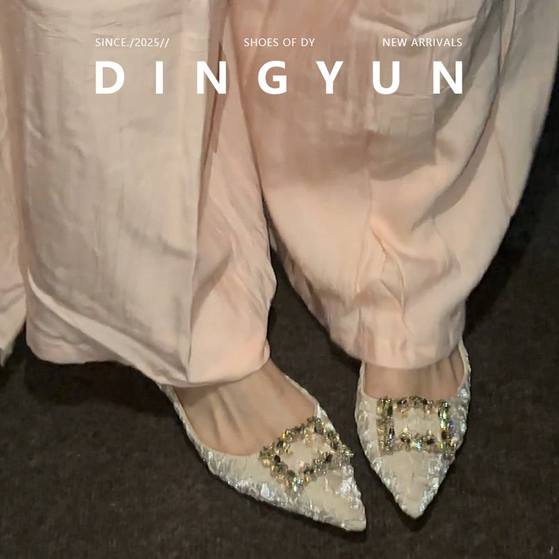 羊皮版dingyun丁允绝美水钻单鞋尖头低跟浅口气质平底女鞋子春夏