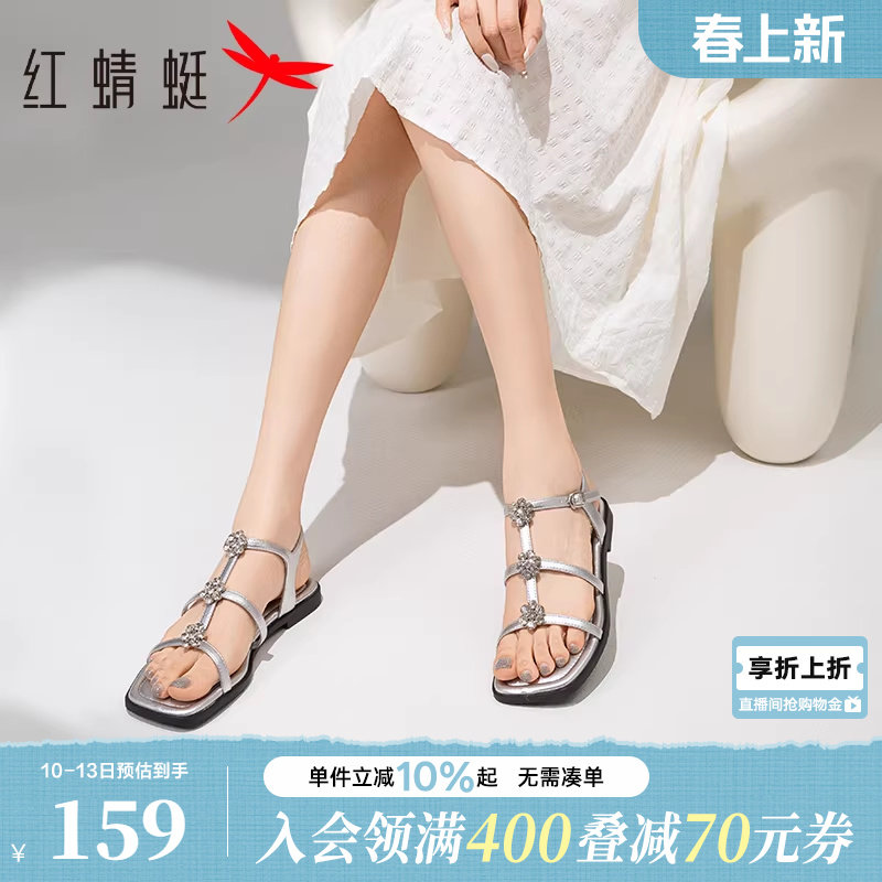 红蜻蜓凉鞋女夏季新款女鞋法式银色平底鞋子绝美水钻罗马凉鞋女款