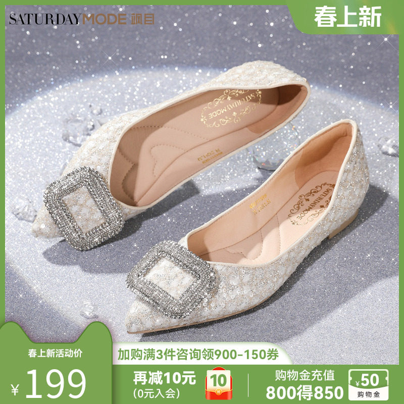星期六尖头浅口单鞋女2025新款平底法式水钻仙女风蝴蝶结个性女鞋