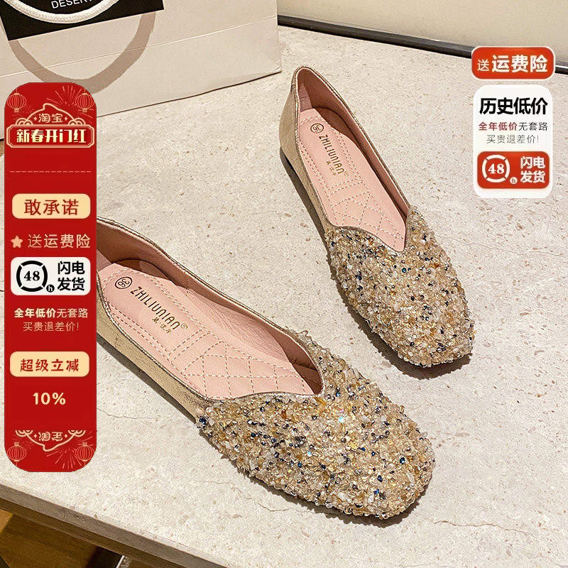 达芙妮水钻单鞋女2026新款早秋浅口平底芭蕾舞鞋法式豆豆女鞋瓢鞋