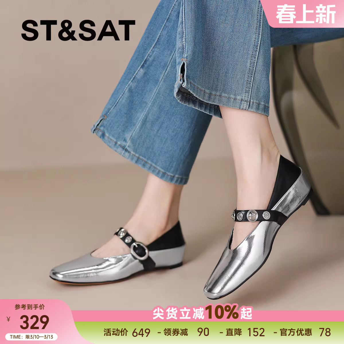 星期六法式单鞋女2025方头平底花朵水钻装饰玛丽珍鞋浅口气质女鞋