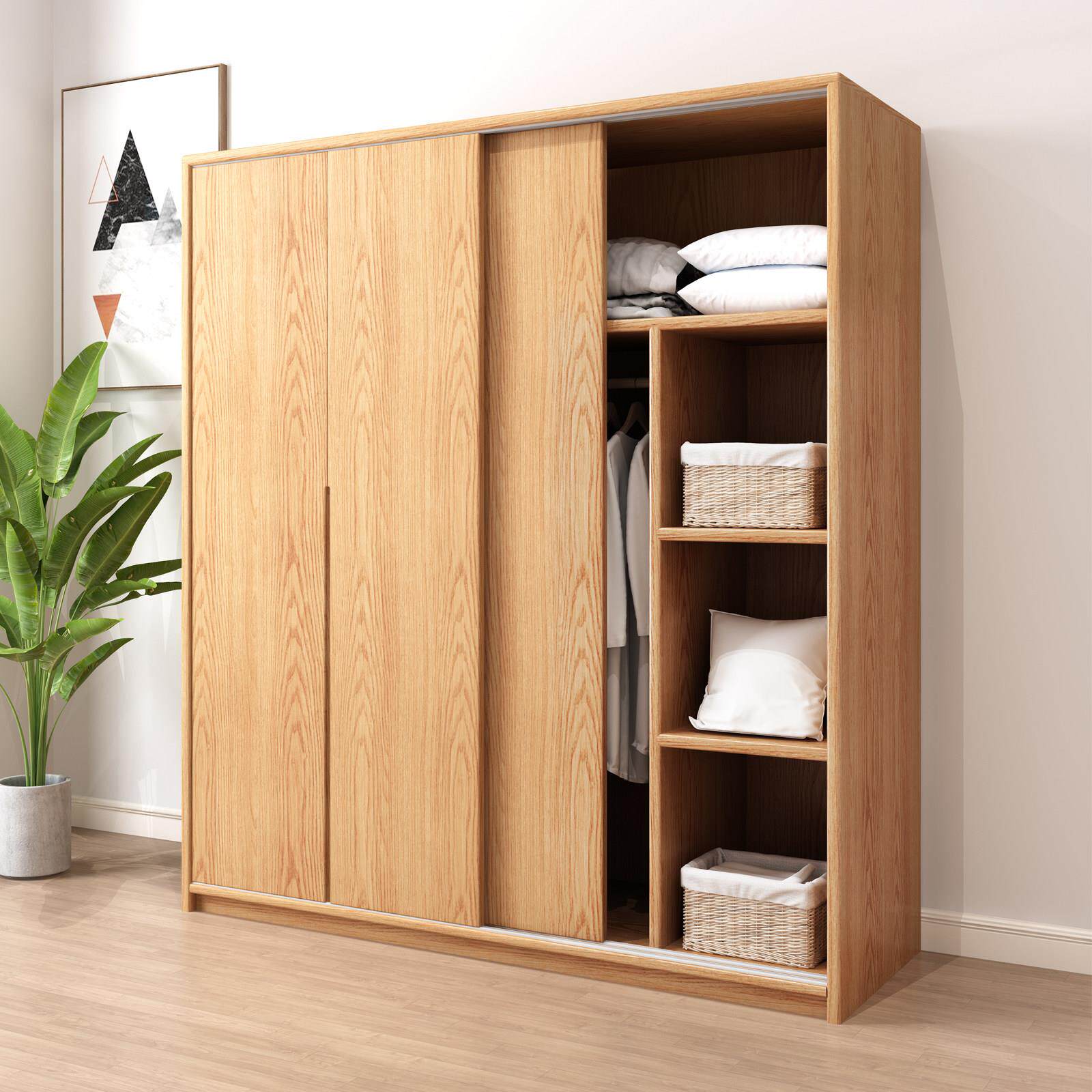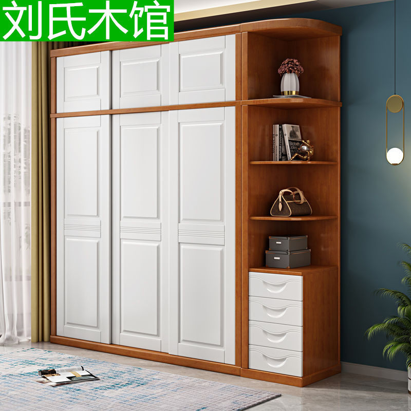 全实木衣柜家用卧室原木风推拉移门柜子小户型出租房用儿童大衣橱