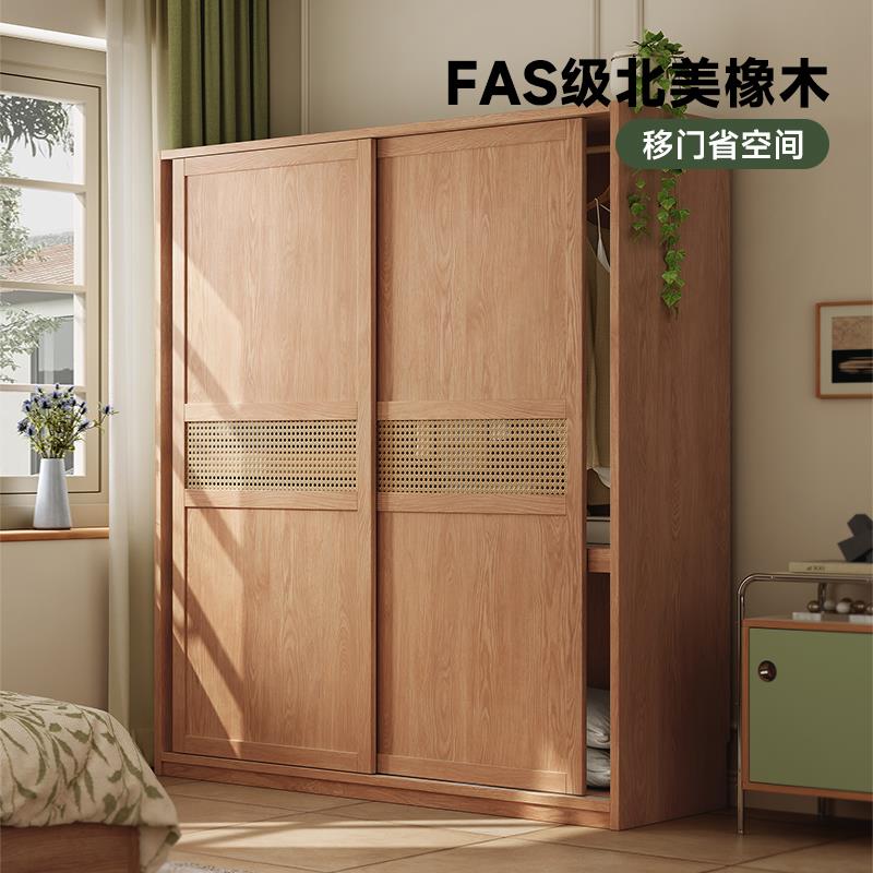 全实木橡木推拉门衣柜家用卧室小户型藤编门滑移门柜子日式大衣橱