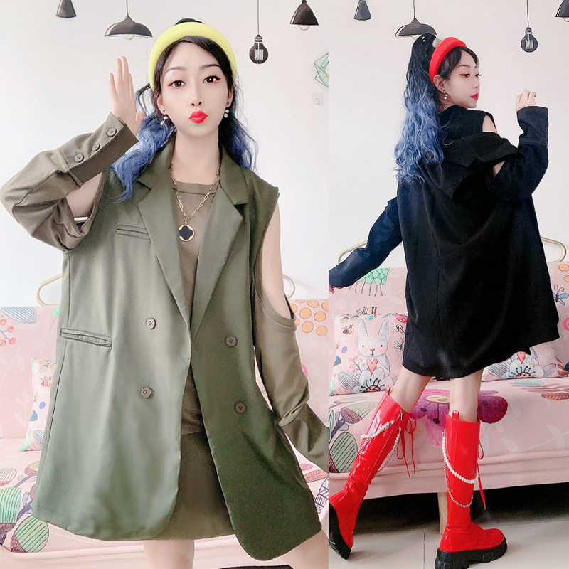 2025秋装新款欧洲站设计个性小众露肩拼接T恤马甲西服裙两件套装