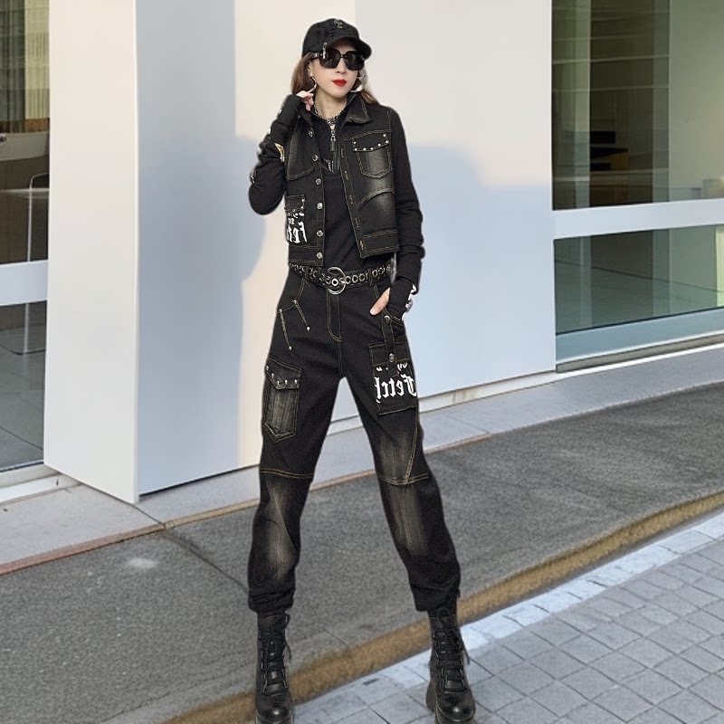 欧洲站2026新款时髦套装休闲时尚个性牛仔直筒宽松裤两件套女士潮