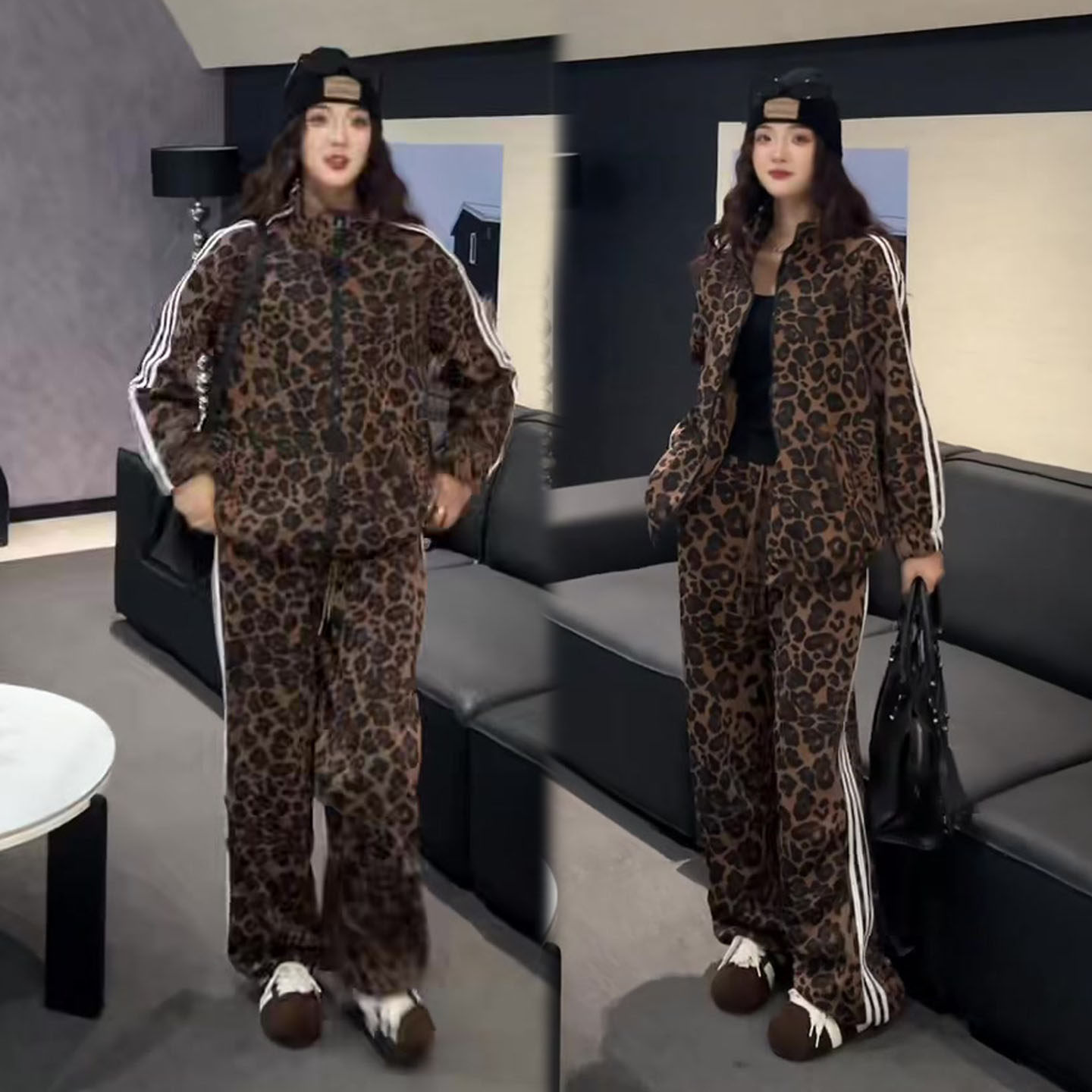 个性潮流豹纹套装女秋冬新款拼接款连帽外套+高腰阔腿裤两件套装