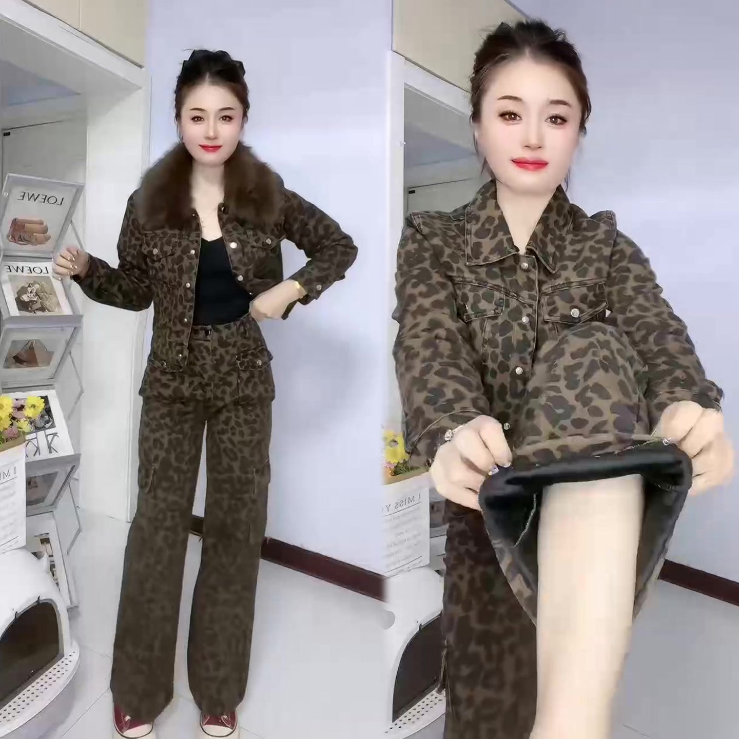 个性潮流豹纹套装女2026春季新款毛领短外套+阔腿裤牛仔加绒两件