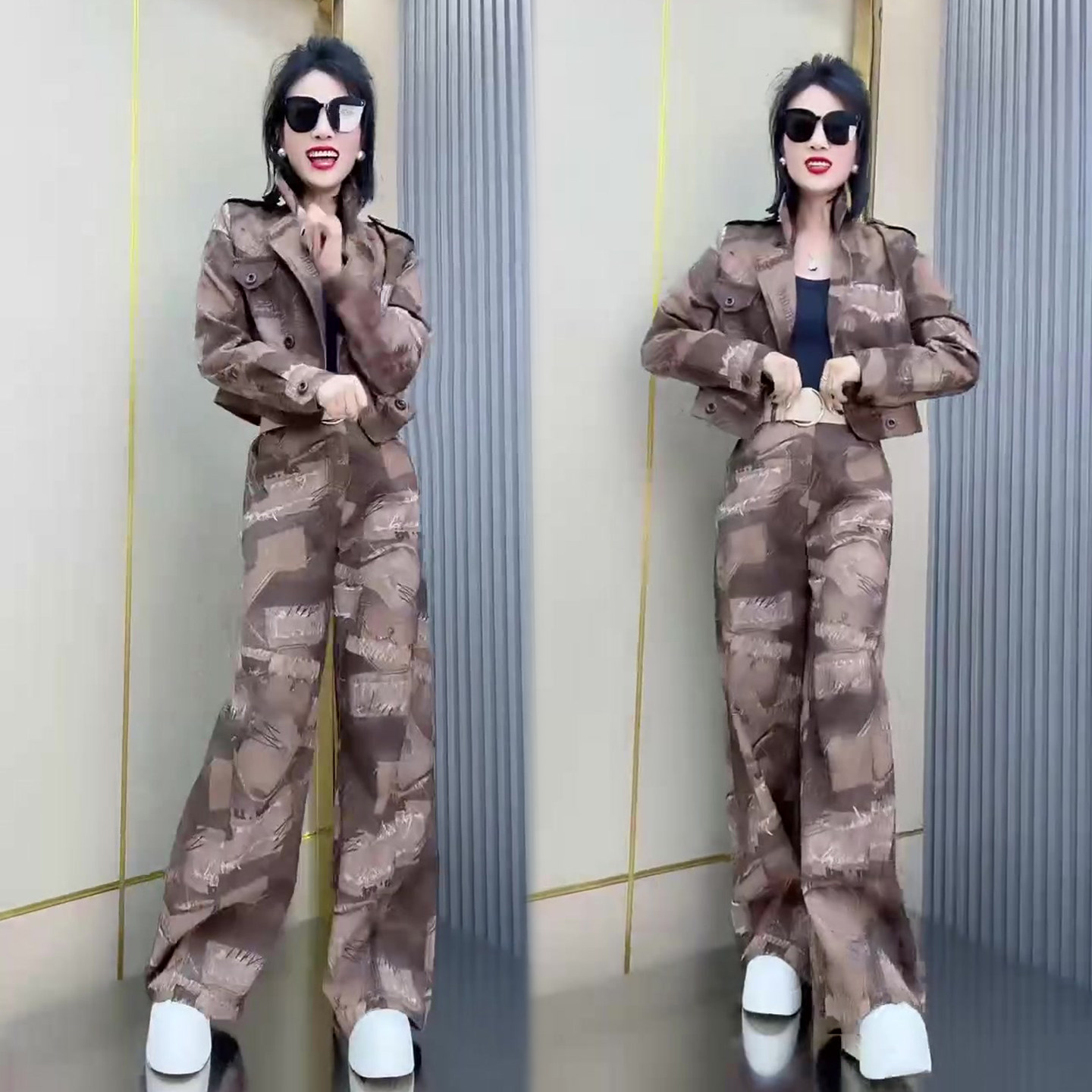潮流个性迷彩套装女2026春季新款翻领牛仔短外套+阔腿长裤两件套