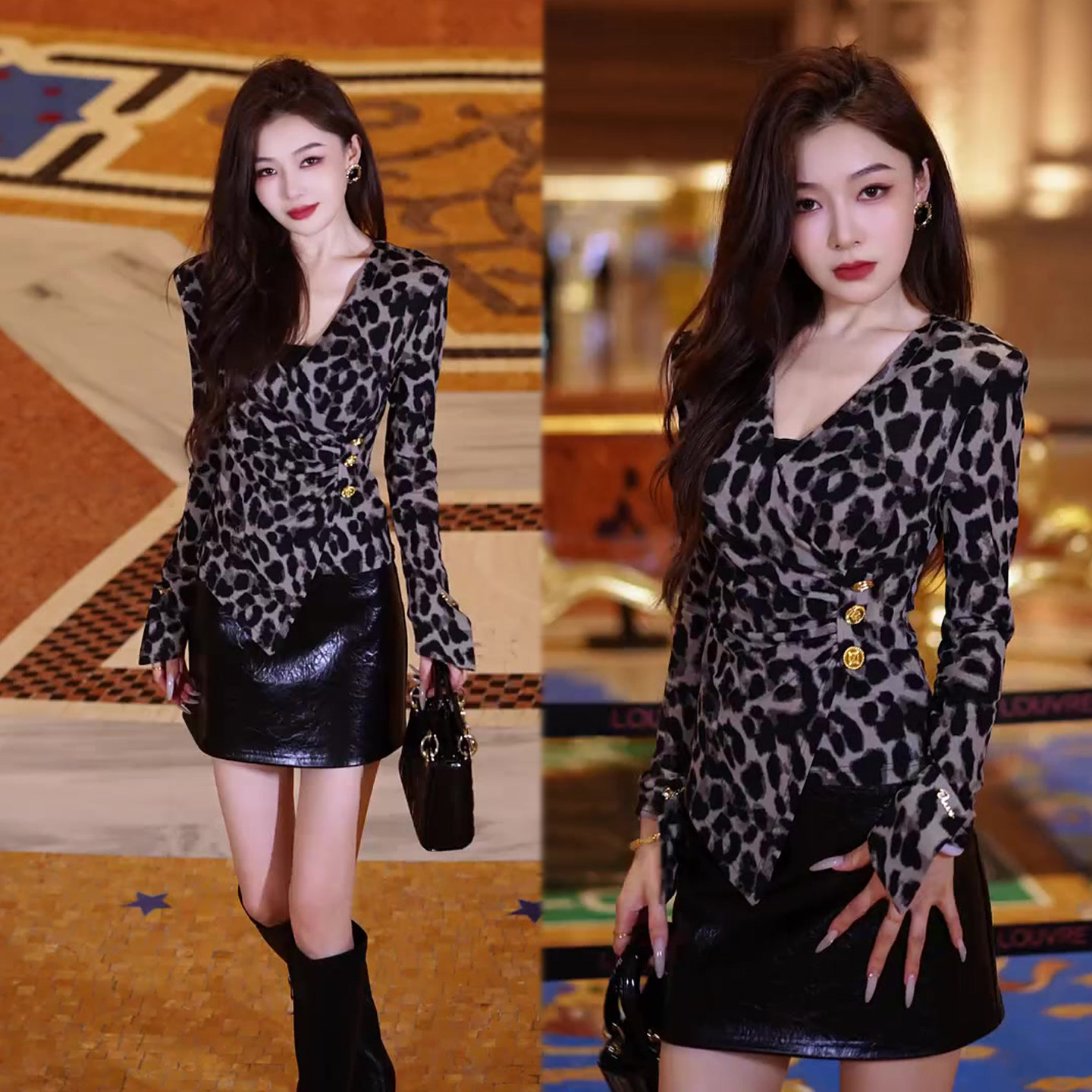 潮流个性豹纹套装女2026春季新款不规则修身上衣+PU皮短裙两件套