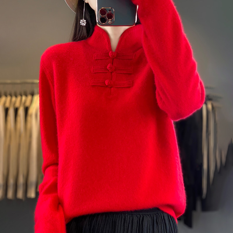 中国风复古盘扣纯色德绒打底衫女2024秋冬新款半高领上衣宽松保暖