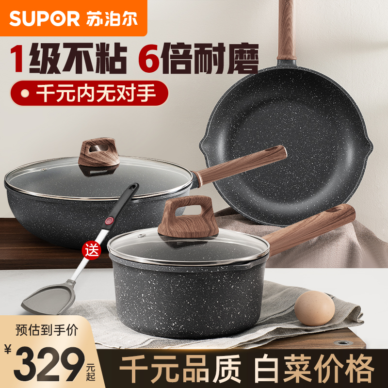 苏泊尔锅具套装全套家用炒菜不粘锅麦饭石色厨房三件套官方旗舰店