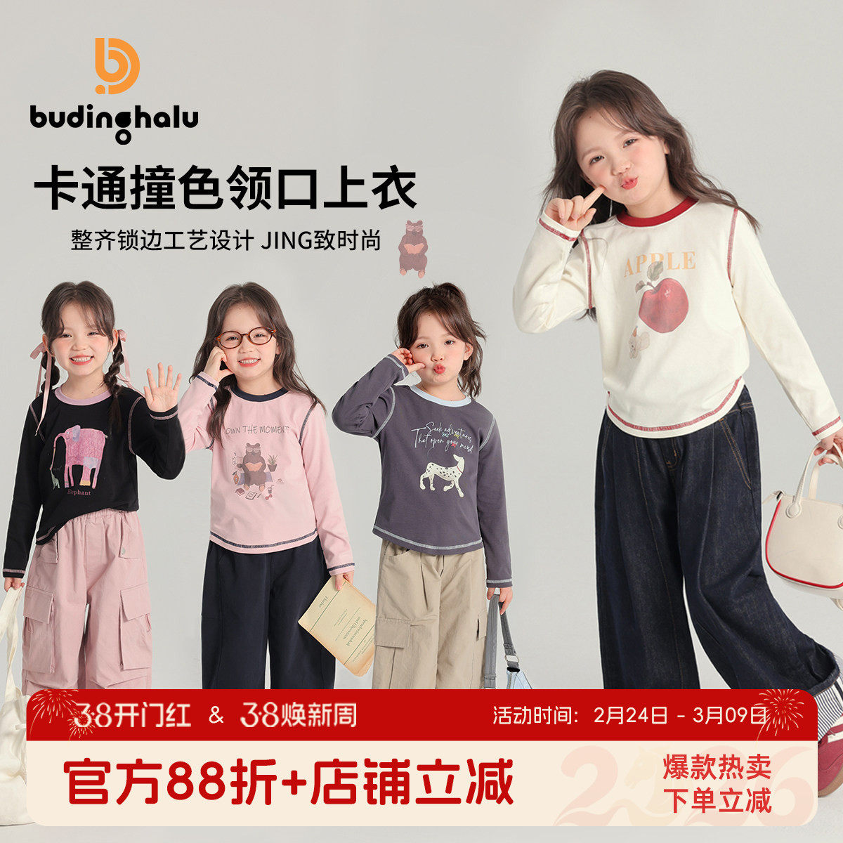 布丁哈鲁秋装女童2026春秋新款儿童卡通撞色圆领长袖T恤打底衫