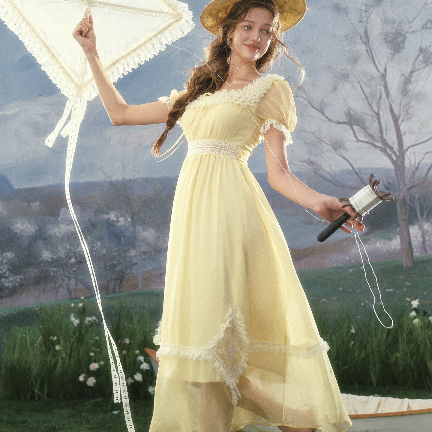 LaceMade 黄风筝 法式复古田园黄色收腰连衣裙泡泡袖蕾丝公主裙女