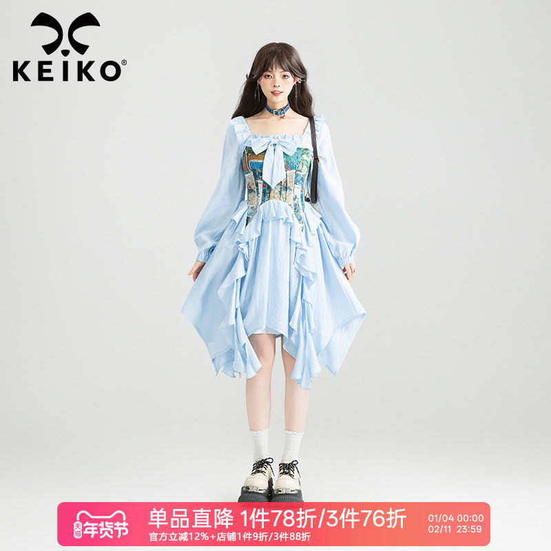 KEIKO 提花拼接收腰方领连衣裙秋季法式宫廷风不规则摆茶歇公主裙