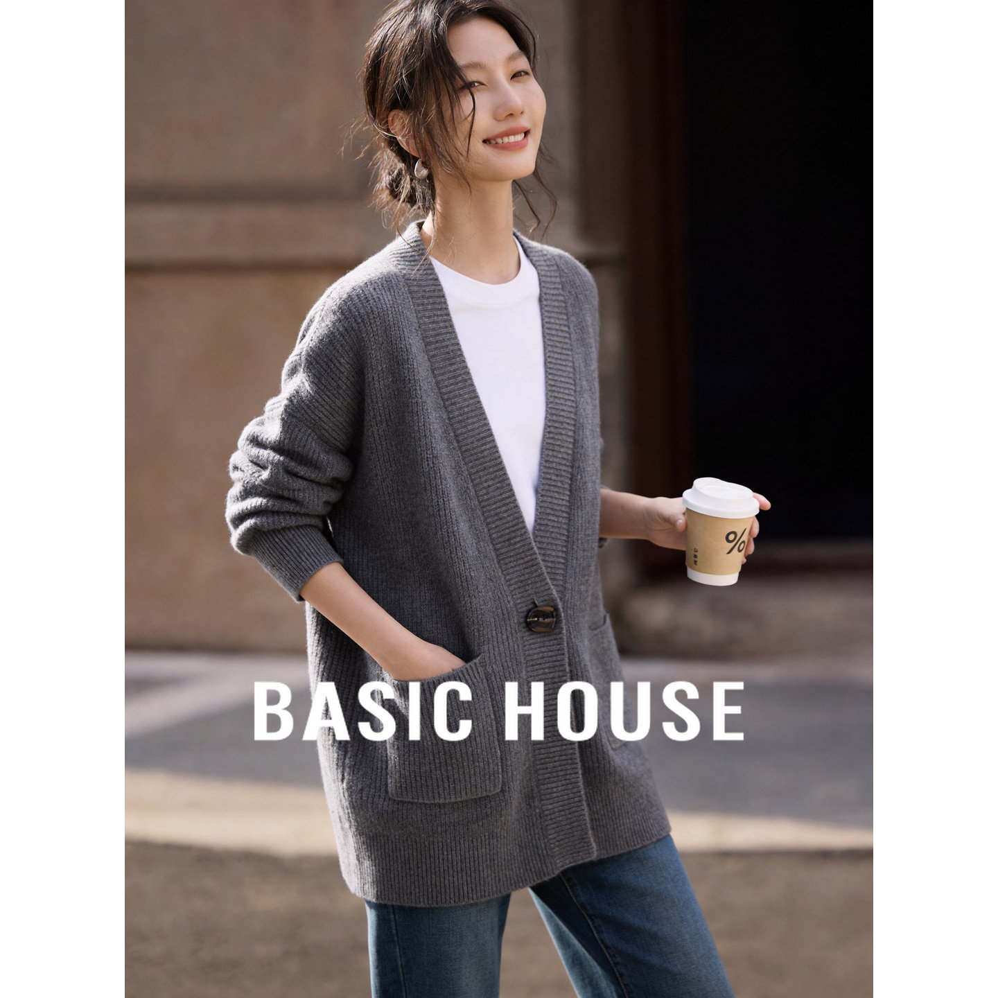 Basic House/百家好灰色V领毛衣开衫显瘦绵羊毛一粒扣中长款外套