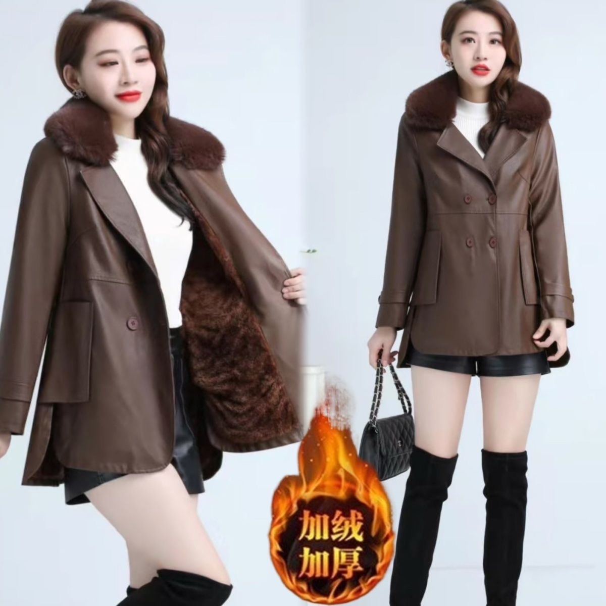 春秋气质皮衣女中长款秋冬韩版修身西装领小个子风衣加绒pu皮外套