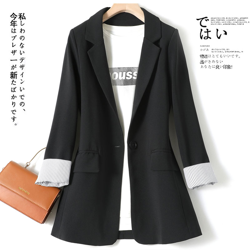 2020春装新款小西装女外套版修身韩版潮中长款长袖小西服条纹袖口