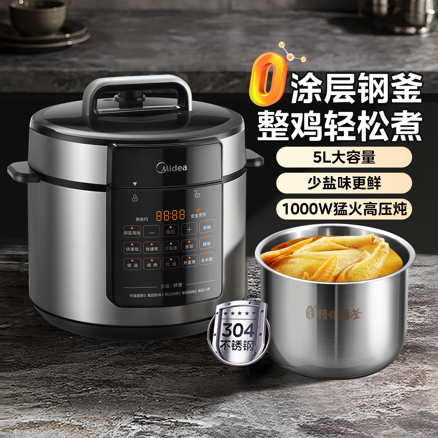 美的电压力锅家用5L大容量双胆0涂层不锈钢多功能高压锅官方正品