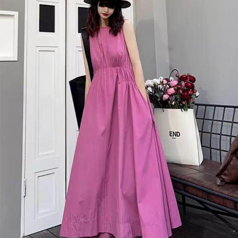 2025夏季女中长款背心裙纯色圆领宽松大码遮肚显瘦无袖打底连衣裙