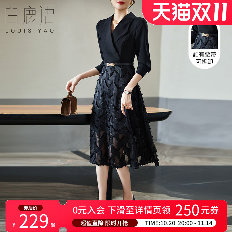 白鹿语高级感连衣裙气质黑色25春款小众礼服拼接网纱中长裙西装裙