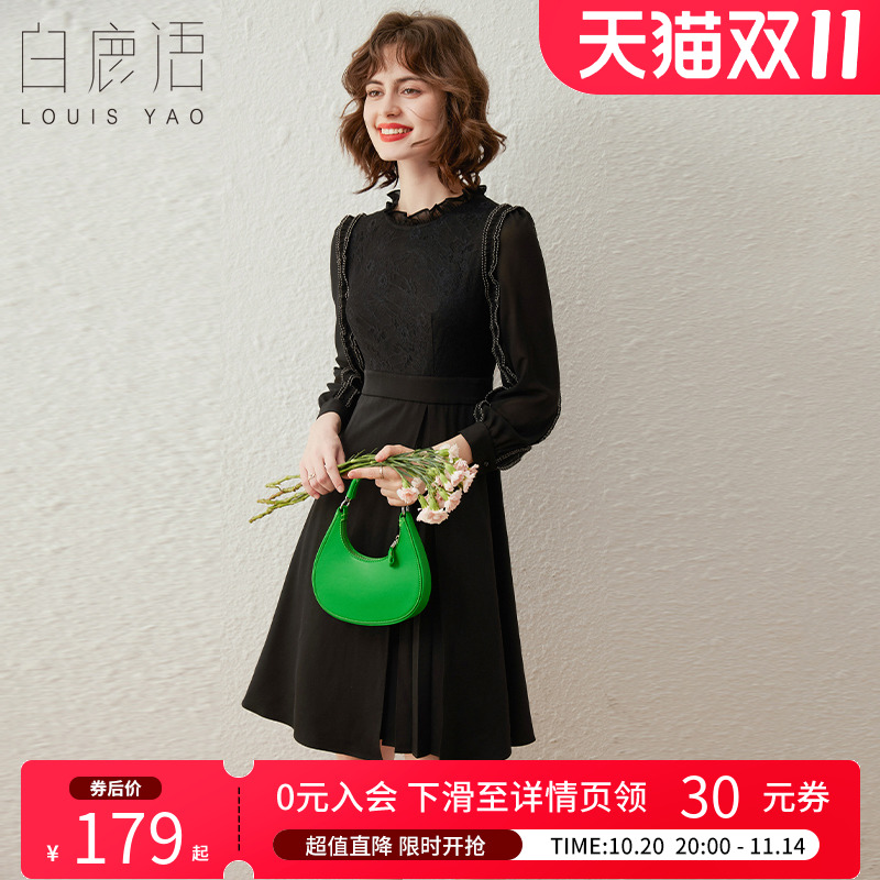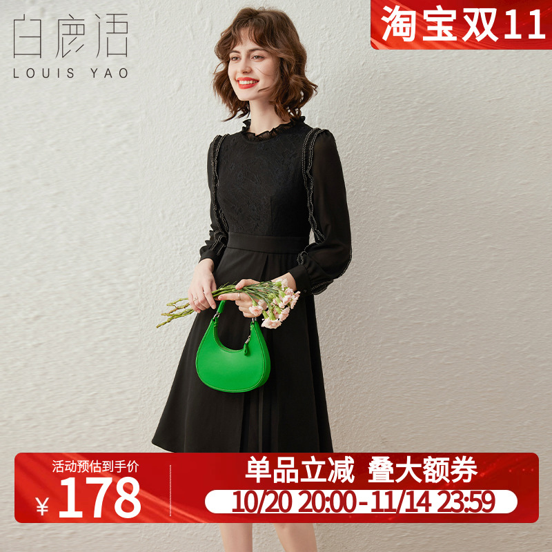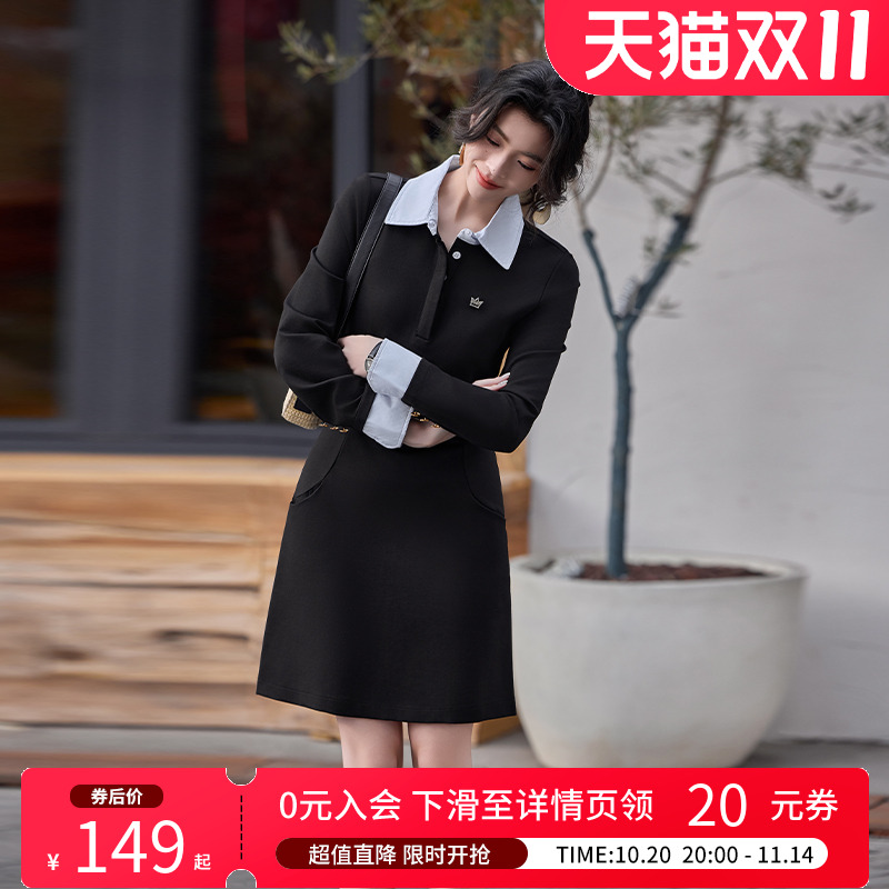 白鹿语法式翻领长袖气质连衣裙女25春款复古学院千金风黑色短裙子