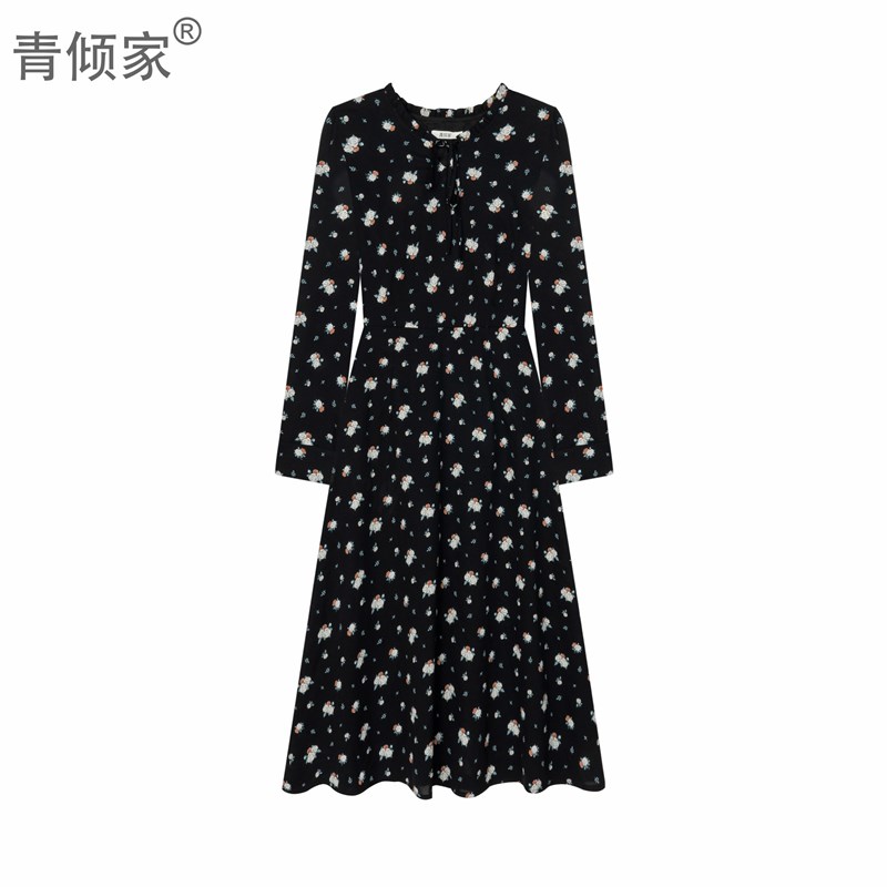 青倾家【花雾语】新款春款黑色碎花中长款连衣裙小清新雪纺感长裙