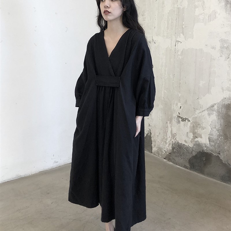 陆与山屿2022春款小众设计感气质长裙子棉麻夏V领黑色女装连衣裙