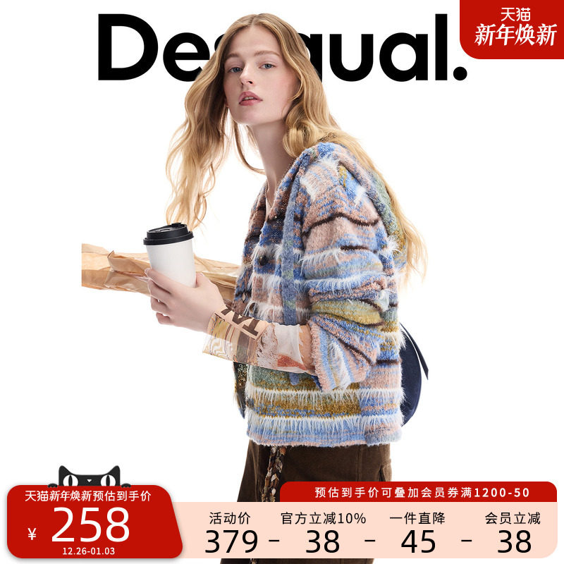 Desigual25秋冬新品针织段染纱蓝白条纹设计连帽开衫女士针织衫