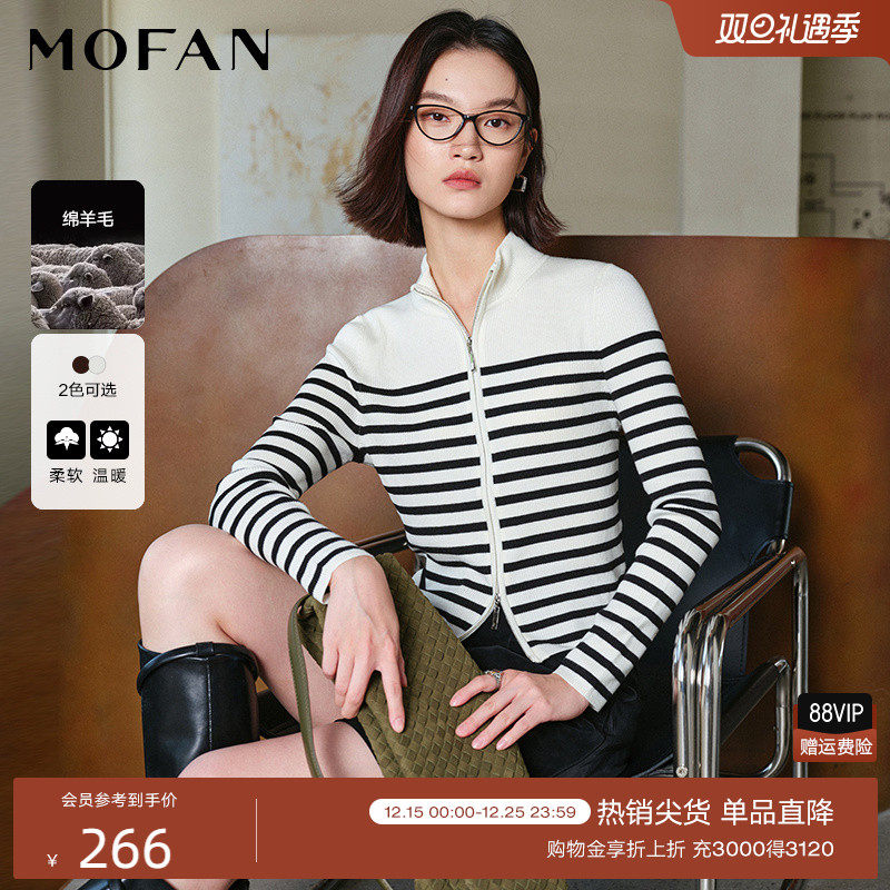 黑白条纹半高领针织开衫女MOFAN摩凡2025冬款双向拉链羊毛衫显瘦