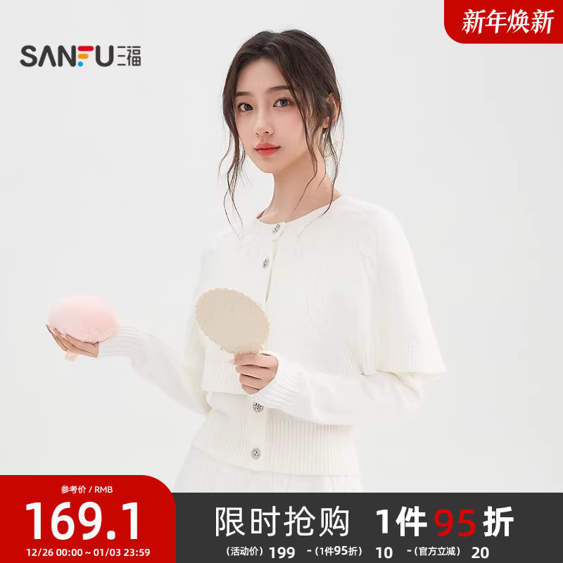 三福白色毛衣女2025新款冬季麻花假两件开衫针织衫上衣女装512835