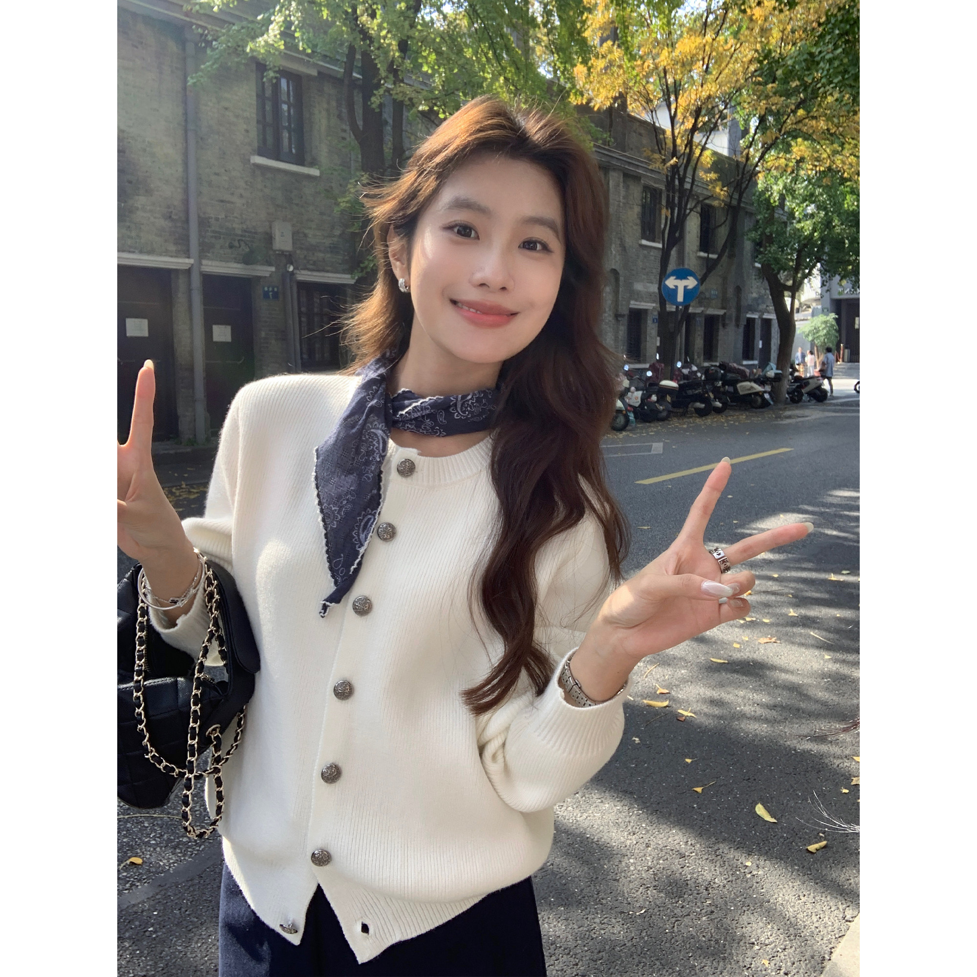 氛围感!慵懒风白色V领毛衣开衫女冬季新款韩版宽松针织衫外套潮