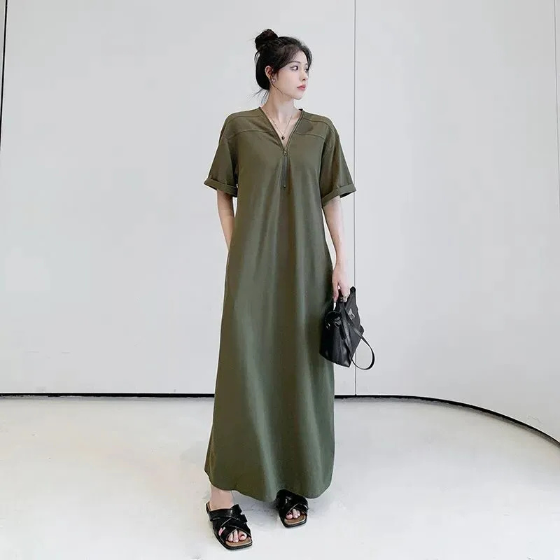 300斤加大码纯色短袖V领过膝长裙胖MM韩版宽松休闲遮臀简约连衣裙
