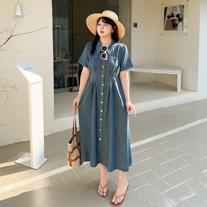 牛仔连衣裙女2025夏季新款220斤胖mm加大码港风气质收腰显瘦长裙
