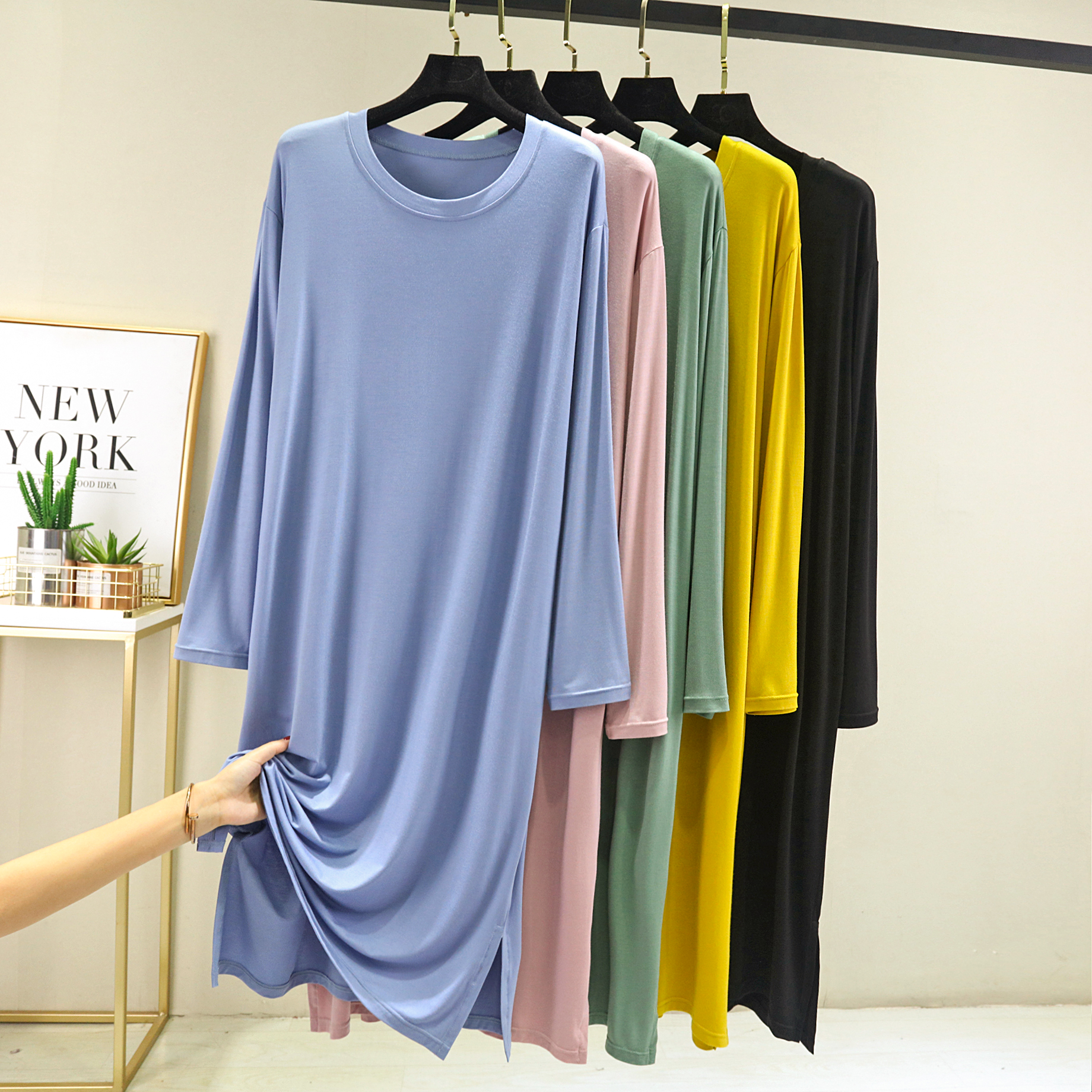 莫代尔睡裙女春季薄款内搭连衣裙纯色加大码百搭休闲宽松圆领长裙