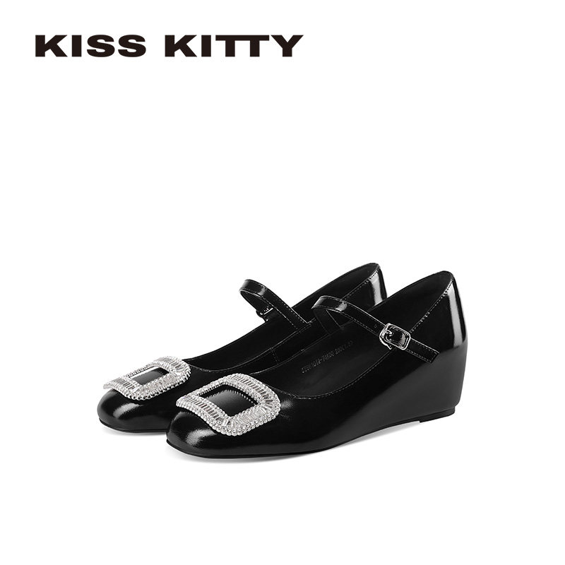 KISSKITTY一字带玛丽珍鞋女2026春款内增高水钻方扣平底浅口单鞋