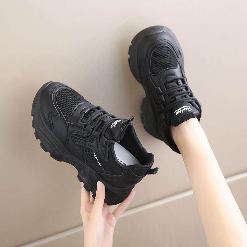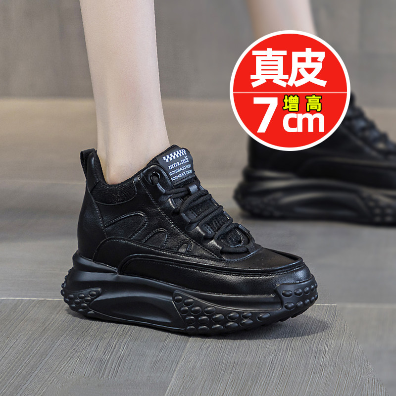 春款小黑鞋女内增高8cm女鞋黑色休闲鞋百搭全黑真皮厚底松糕白鞋