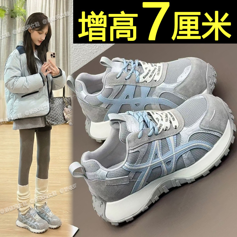 真皮~骄屿7CM内增高德训鞋女2025新款厚底透气休闲蓝色运动阿甘鞋