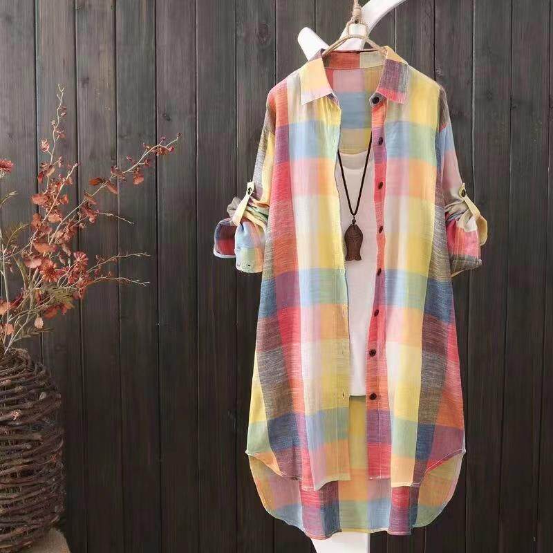 跨境外贸衬衫女时尚设计感小众中长款宽松棉麻薄外套防晒格子衬衣