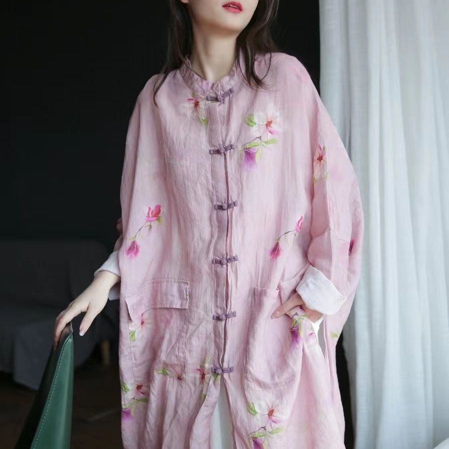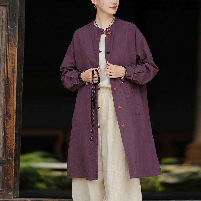 远镇夏秋款开衫薄款苎麻中长款盘扣上衣棉麻衬衫长袖中式女装茶服