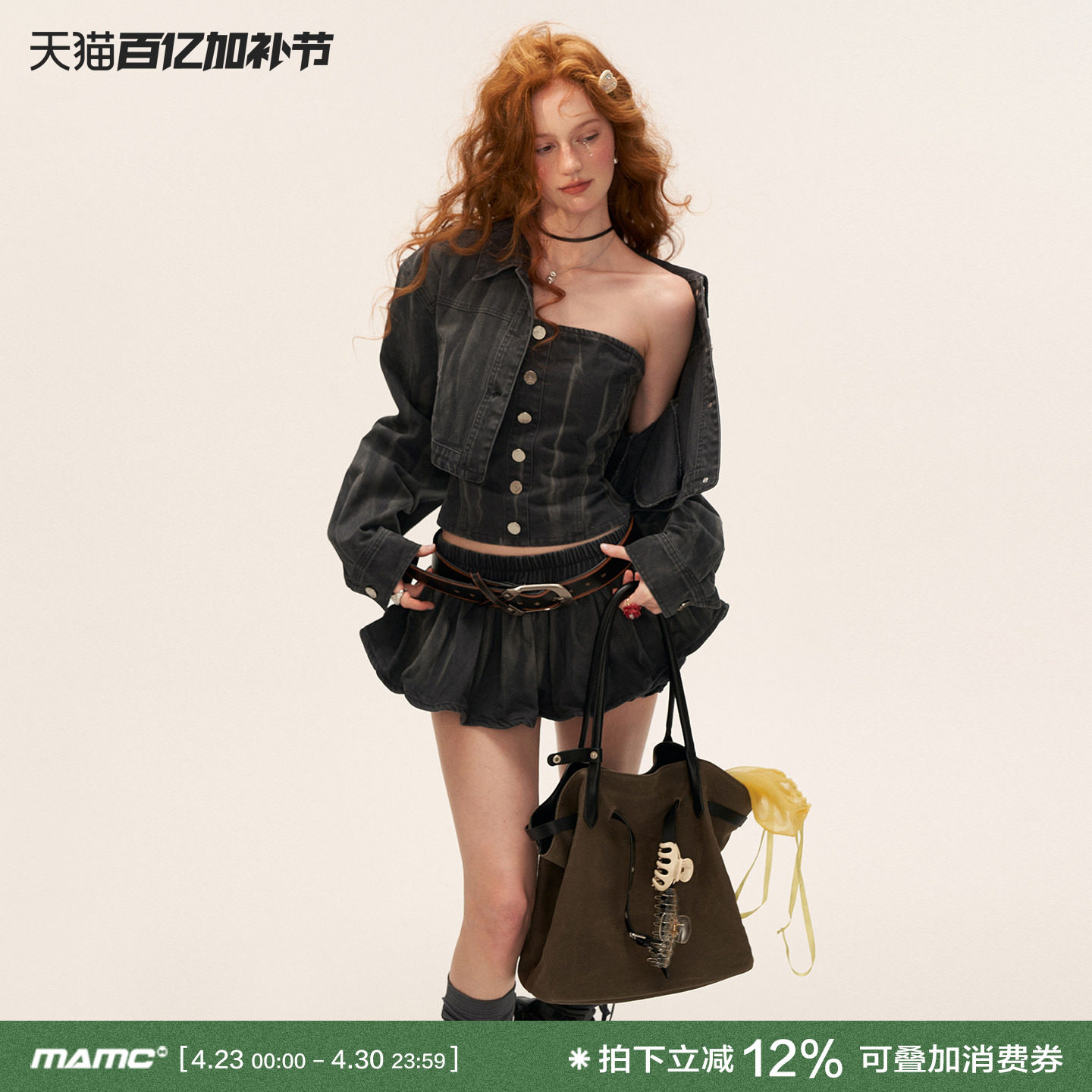 MAMC复古水洗纽扣一字肩花苞短裙2026年春季新款短款外套牛仔套装