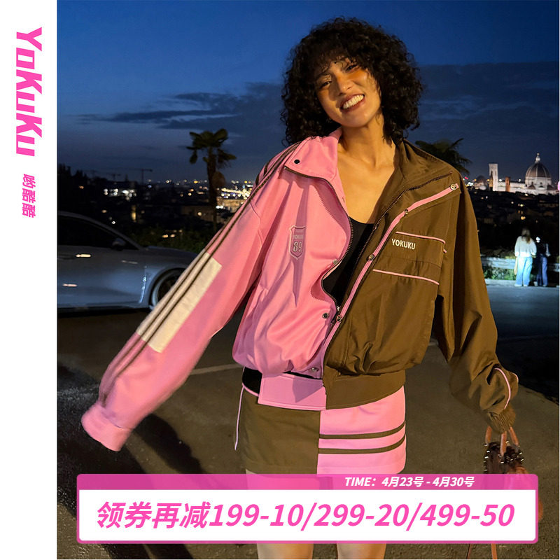 哟酷酷 春季粉棕撞色条纹套装女运动户外山系宽松外套短裙两件套
