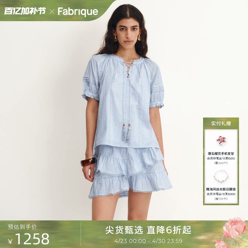 Fabrique婴儿蓝纯棉短袖衬衫上衣短裙套装春夏季波嬉风两件套女