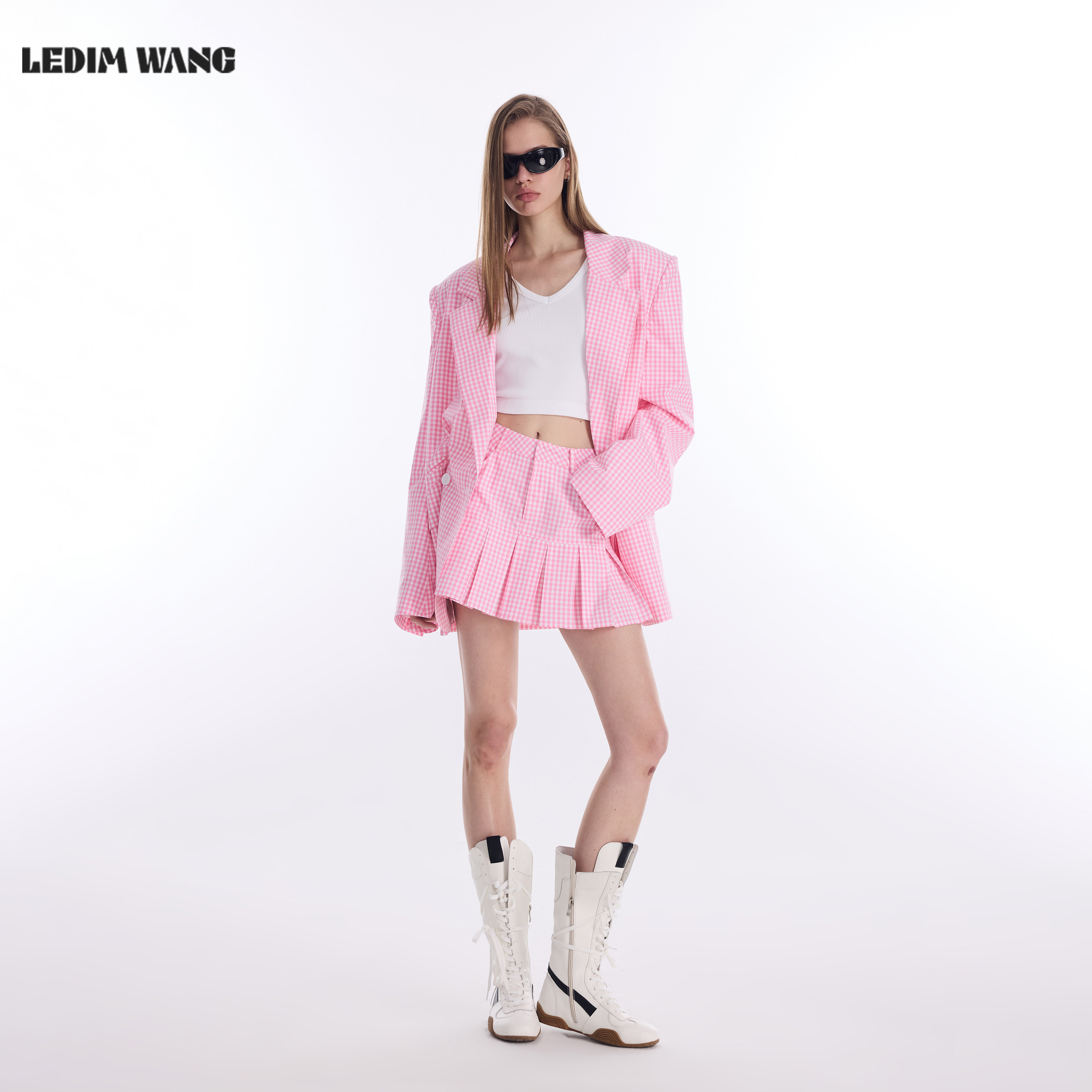 LEDIM WANG学院风粉色西服短裙时尚套装女2026春新款通勤格纹阔版