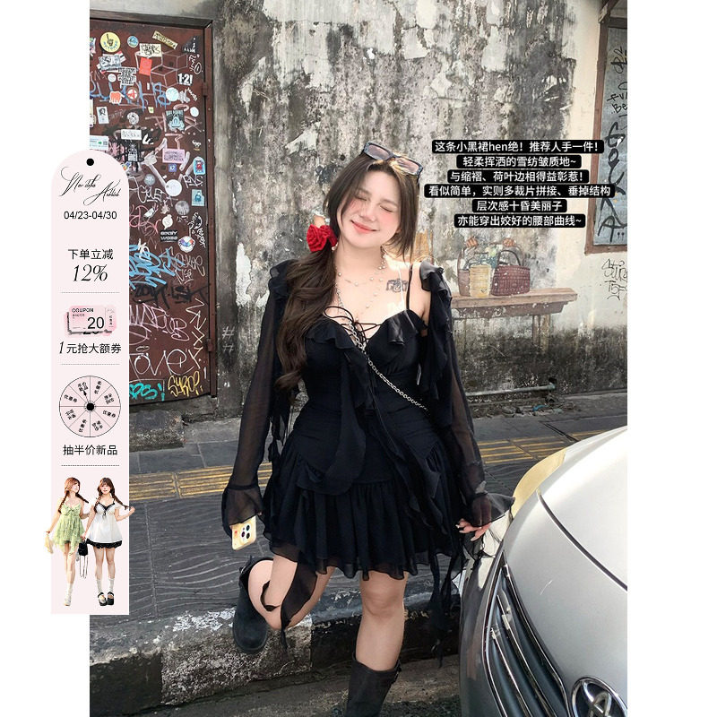 安妮不火 纯欲荷叶边雪纺短裙女2025春夏新款微胖大码小黑裙套装