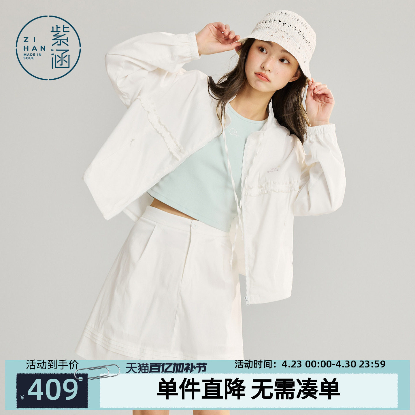 班尼路白色防晒套装女春夏新款短款防晒服高腰半身短裙两件装女N
