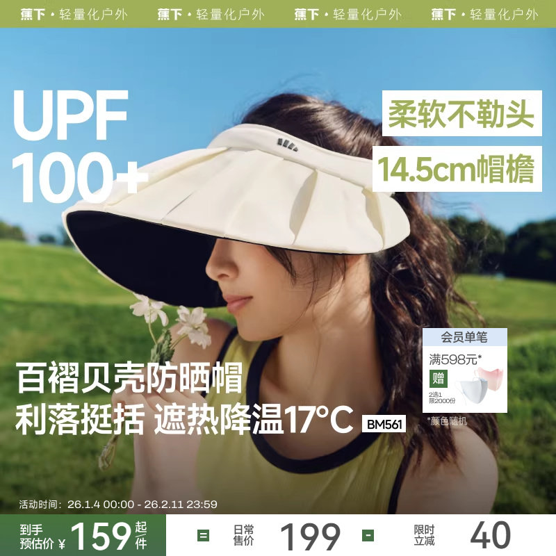 蕉下百褶贝壳帽夏季丝绒黑胶防晒帽女防紫外线凉感透气太阳空顶帽