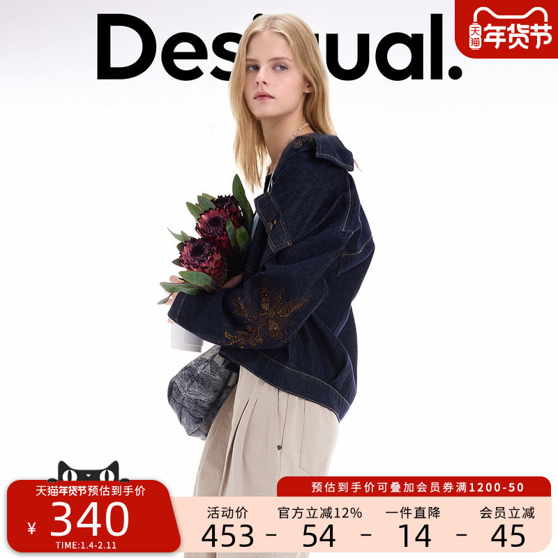 Desigual25秋冬新品花朵钉珠刺绣翻领拉链夹克女士牛仔外套