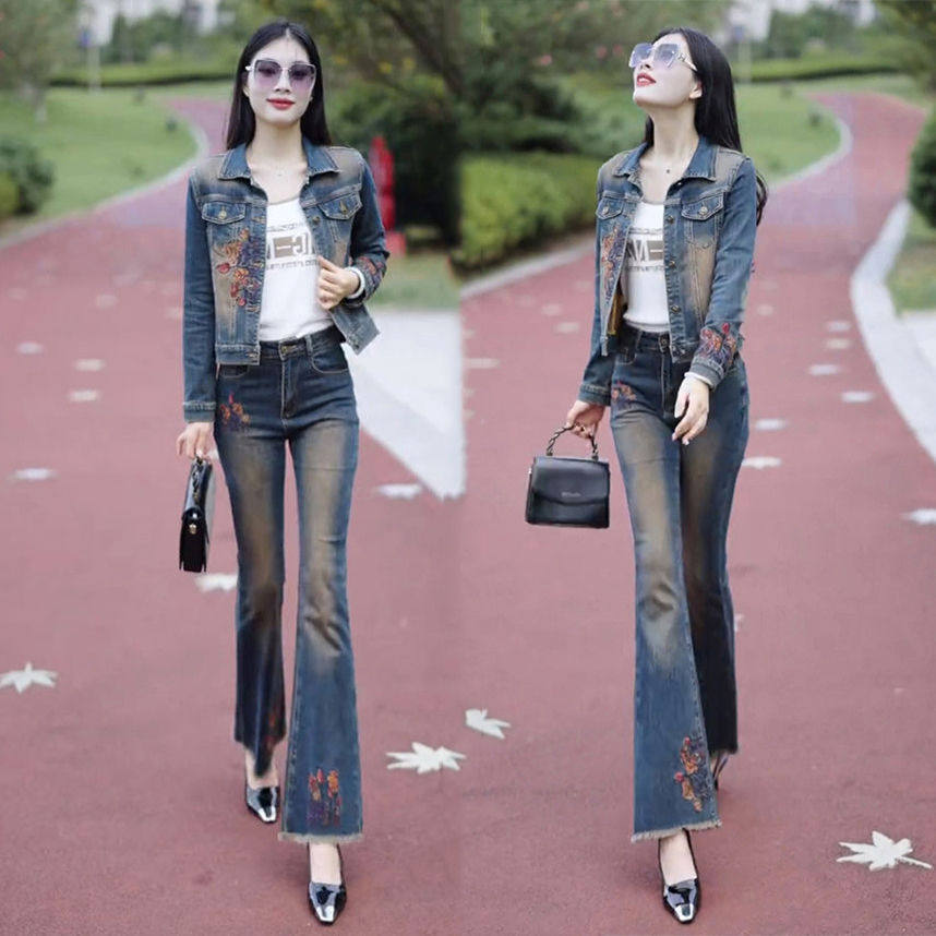 早春新款刺绣花朵毛边微喇叭裤牛仔外套复古修身时尚洋气两件套女