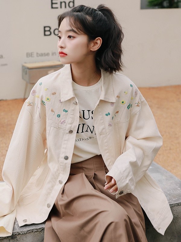 中性百搭花朵刺绣牛仔外套女米白色百搭宽松翻领中长款夹克上衣帅
